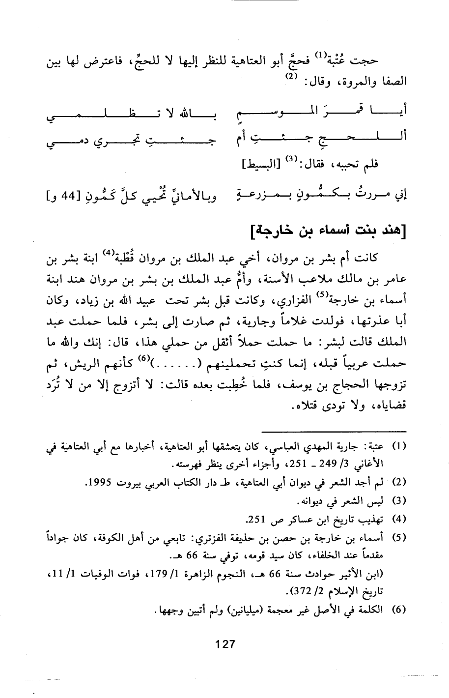 [1] عتبة: جارية المهدي العباسي، كان يتعشقها أبو العتاهية، أخبارها مع أبي العتاهية في الأغاني 3/249- 251، وأجزاء أخرى ينظر فهرسته.