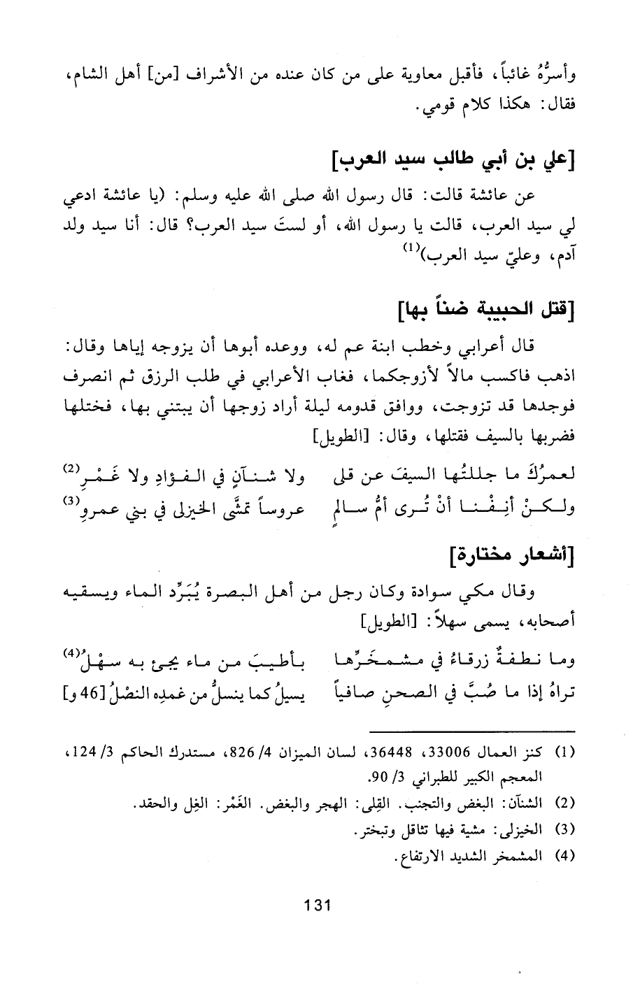 عن عائشة قالت: قال رسول الله صلى الله عليه وسلم: (يا عائشة ادعي لي سيد العرب، قالت يا رسول الله، أو لست سيد العرب؟ قال: أنا سيد ولد آدم، وعليّ سيد العرب) [1]