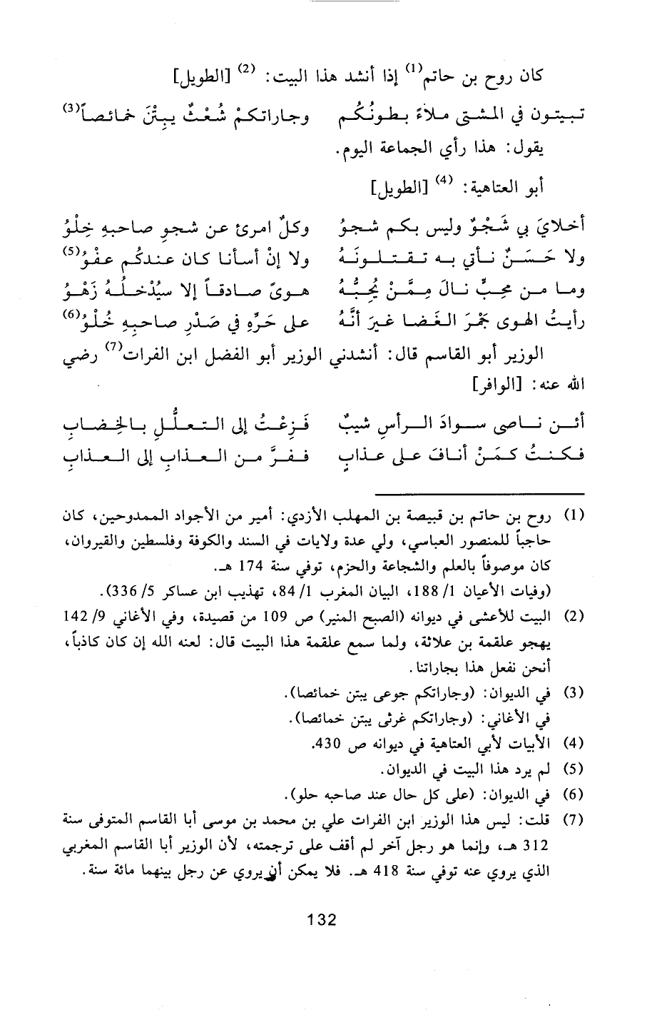 [1] روح بن حاتم بن قبيصة بن المهلب الأزدي: أمير من الأجواد الممدوحين، كان حاجبا للمنصور العباسي، ولي عدة ولايات في السند والكوفة وفلسطين والقيروان، كان موصوفا بالعلم والشجاعة والحزم، توفي سنة 174 هـ.