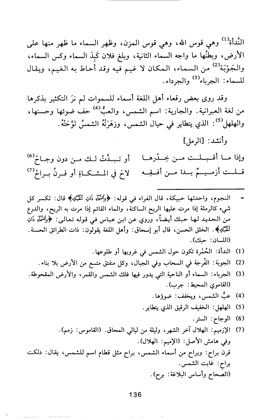 وقد روى بعض رقعاء أهل اللغة أسماء للسموات لم نر التكثير بذكرها من لغة العبرانية. والجارية: اسم الشمس، والعبّ [4] حف ضوئها وحسنها، والهلهل [5] : الذي يتطاير في حيال الشمس، وزهرته الشمس لوّحته.