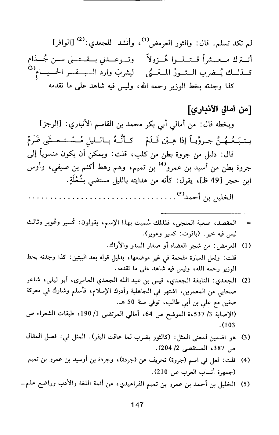 [2] الجعدي: النابغة الجعدي، قيس بن عبد الله الجعدي العامري، أبو ليلى، شاعر صحابي من المعمرين، اشتهر في الجاهلية وأدرك الإسلام، فأسلم وشارك في معركة صفين مع علي بن أبي طالب، توفي سنة 50 هـ-.