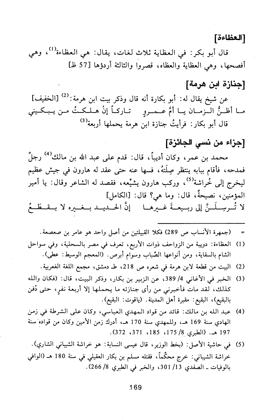 [3] الخبر في الأغاني 4/389، عن الزبير بن بكار، وذكر البيت، قال: (فكان والله كذلك، لقد مات فأخبرني من رأى جنازته ما يحملها إلا أربعة نفر، حتى دفن بالبقيع) ، البقيع: مقبرة أهل المدينة. (ياقوت: البقيع) .