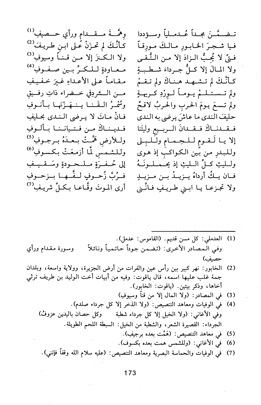 [2] الخابور: نهر كبير بين رأس عين والفرات من أرض الجزيرة، وولاية واسعة، وبلدان جمة غلب عليها اسمه، قال ياقوت: وفيه من أبيات أخت الوليد بن طريف ترثي أخاها، وذكر بيتين. (ياقوت: الخابور) .