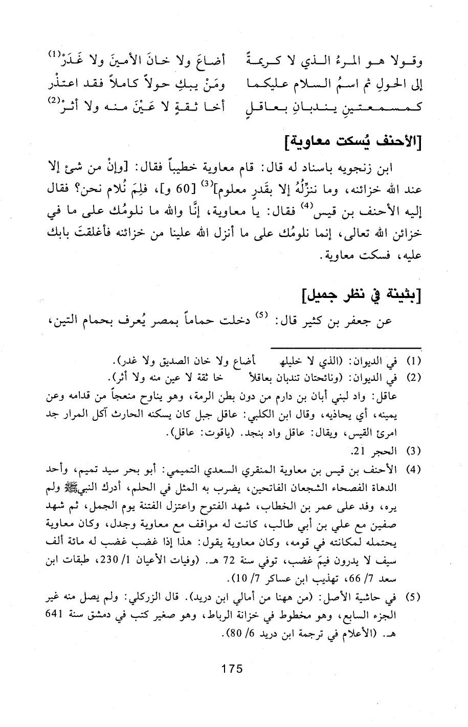[4] الأحنف بن قيس بن معاوية المنقري السعدي التميمي: أبو بحر سيد تميم، وأحد الدهاة الفصحاء الشجعان الفاتحين، يضرب به المثل في الحلم، أدرك النبي صلى الله عليه وسلم ولم يره، وفد على عمر بن الخطاب، شهد الفتوح واعتزل الفتنة يوم الجمل، ثم شهد صفين مع علي بن أبي طالب، كانت له مواقف مع معاوية وجدل، وكان معاوية يحتمله لمكانته في قومه، وكان معاوية يقول: هذا إذا غضب غضب له مائة ألف سيف لا يدرون فيم غضب، توفي سنة 72 هـ. (وفيات الأعيان 1/230، طبقات ابن سعد 7/66، تهذيب ابن عساكر 7/10) .