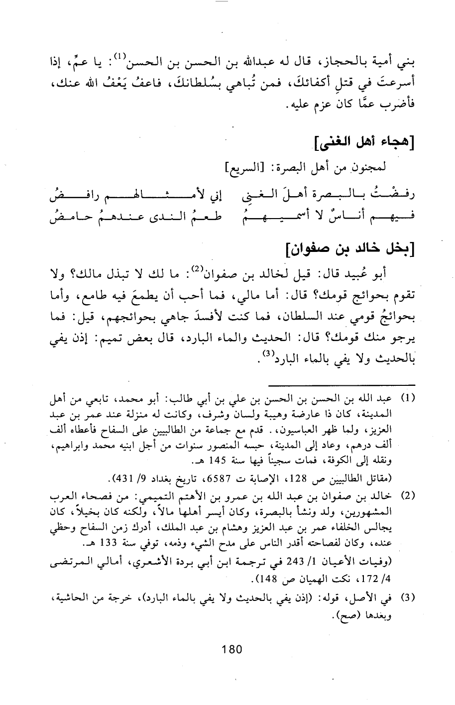 [2] خالد بن صفوان بن عبد الله بن عمرو بن الأهتم التميمي: من فصحاء العرب المشهورين، ولد ونشأ بالبصرة، وكان أيسر أهلها مالا، ولكنه كان بخيلا، كان يجالس الخلفاء عمر بن عبد العزيز وهشام بن عبد الملك، أدرك زمن السفاح وحظي عنده، وكان لفصاحته أقدر الناس على مدح الشيء وذمه، توفي سنة 133 هـ.