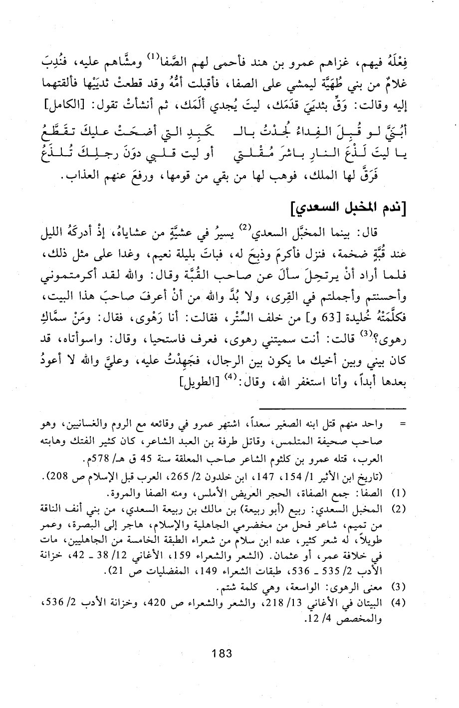 [2] المخبل السعدي: ربيع (أبو ربيعة) بن مالك بن ربيعة السعدي، من بني أنف الناقة من تميم، شاعر فحل من مخضرمي الجاهلية والإسلام، هاجر إلى البصرة، وعمر طويلا، له شعر كثير، عده ابن سلام من شعراء الطبقة الخامسة من الجاهلين، مات في خلافة عمر، أو عثمان. (الشعر والشعراء 159، الأغاني 12/38- 42، خزانة الأدب 2/535- 536، طبقات الشعراء 149، المفضليات ص 21) .