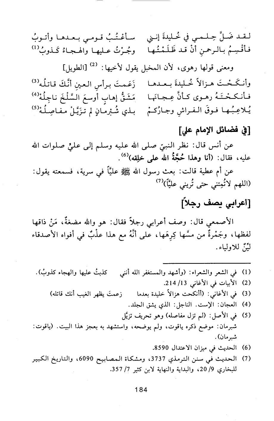 الأصمعي قال: وصف أعرابي رجلا فقال: هو والله مضغة، من ذاقها لفظها، وجمرة من مسّها كرهها، على أنّه مع هذا عذب في أفواه الأصدقاء ليّن للاولياء.