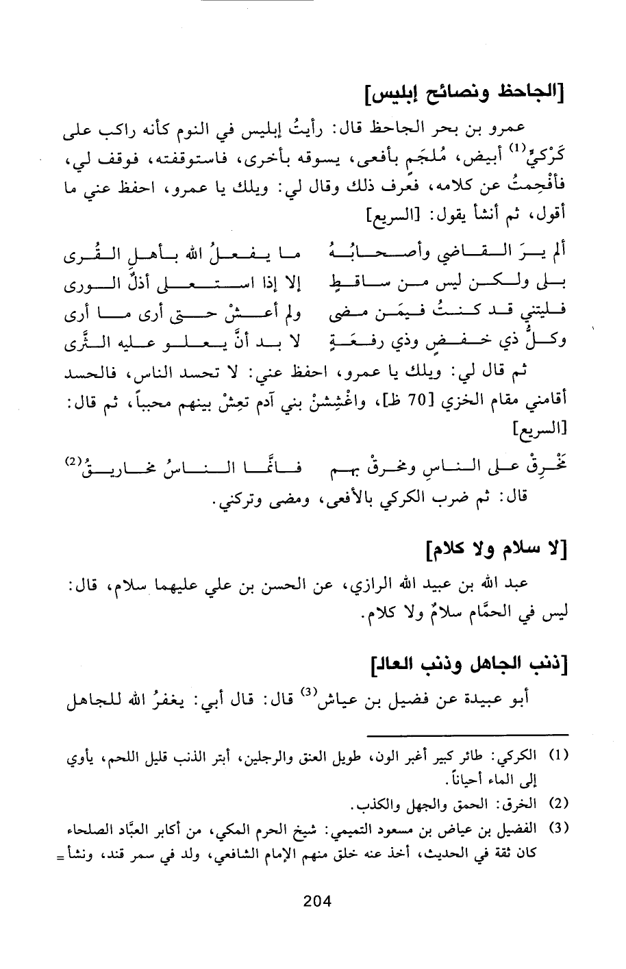 عمرو بن بحر الجاحظ قال: رأيت إبليس في النوم كأنه راكب على كركيّ [1] أبيض، ملجم بأفعى، يسوقه بأخرى، فاستوقفته، فوقف لي، فأفحمت عن كلامه، فعرف ذلك وقال لي: ويلك يا عمرو، احفظ عني ما أقول، ثم أنشأ يقول: [السريع]