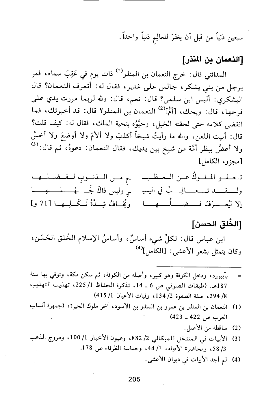 قال: أبيت اللعن، والله ما رأيت شيخا أكذب ولا ألأم ولا أوضع ولا أخسّ ولا أعضّ ببظر أمّة من شيخ بين يديك، فقال النعمان: دعوه، ثم قال: [3] [مجزوء الكامل]