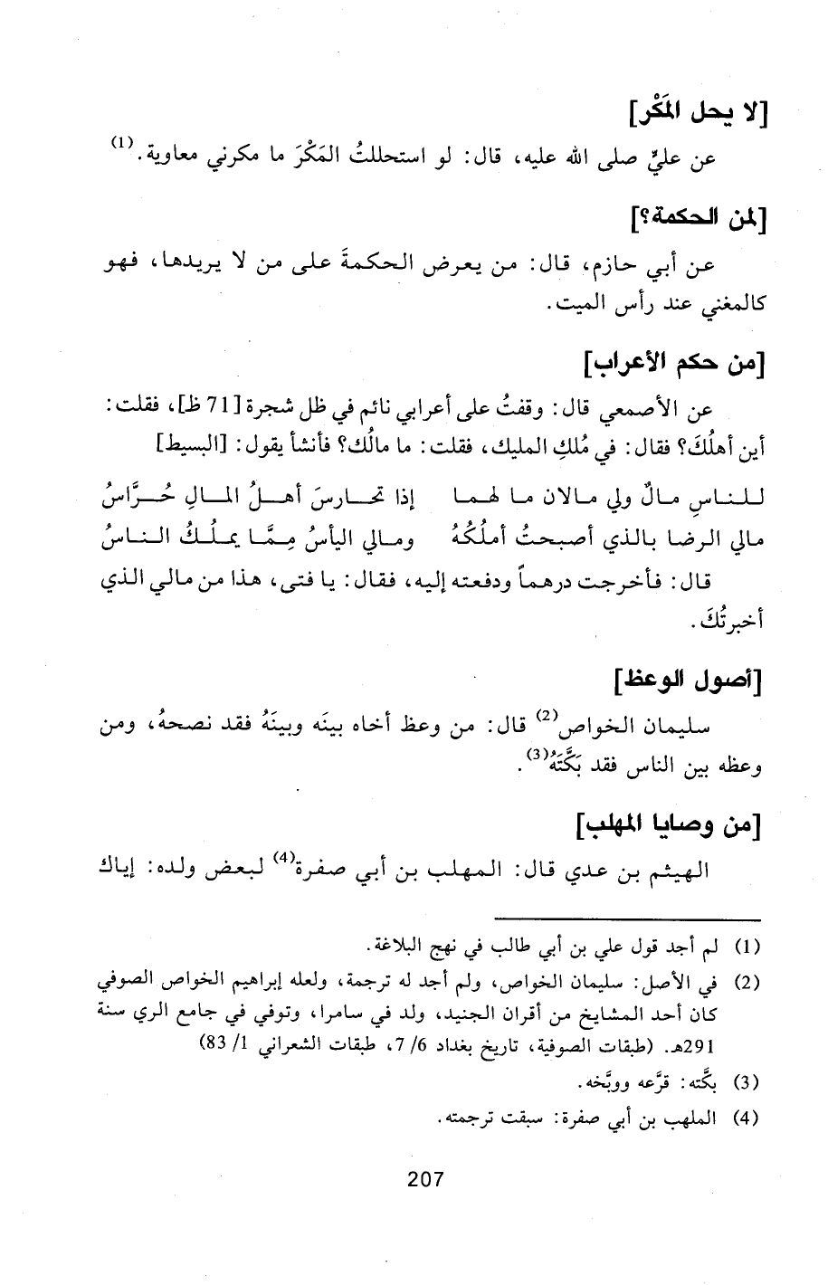 [2] في الأصل: سليمان الخواص، ولم أجد له ترجمة، ولعله إبراهيم الخواص الصوفي كان أحد المشايخ من أقران الجنيد، ولد في سامرا، وتوفي في جامع الري سنة 291 هـ. (طبقات الصوفية، تاريخ بغداد 6/7، طبقات الشعراني 1/83)