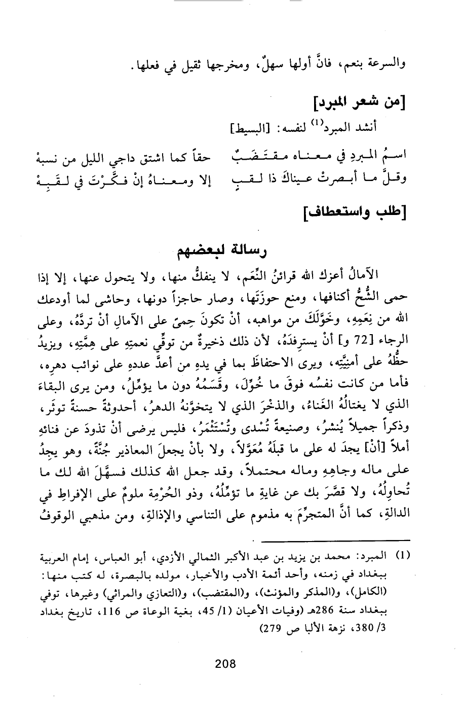 [1] المبرد: محمد بن يزيد بن عبد الأكبر الثمالي الأزدي، أبو العباس، إمام العربية ببغداد في زمنه، وأحد أئمة الأدب والأخبار، مولده بالبصرة، له كتب منها: