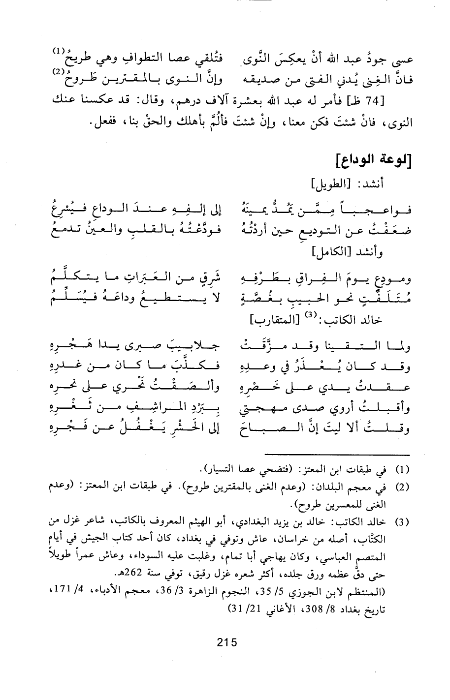 [3] خالد الكاتب: خالد بن يزيد البغدادي، أبو الهيثم المعروف بالكاتب، شاعر غزل من الكتّاب، أصله من خراسان، عاش وتوفي في بغداد، كان أحد كتاب الجيش في أيام المتصم العباسي، وكان يهاجي أبا تمام، وغلبت عليه السوداء، وعاش عمرا طويلا حتى دقّ عظمه ورق جلده، أكثر شعره غزل رقيق، توفي سنة 262 هـ.