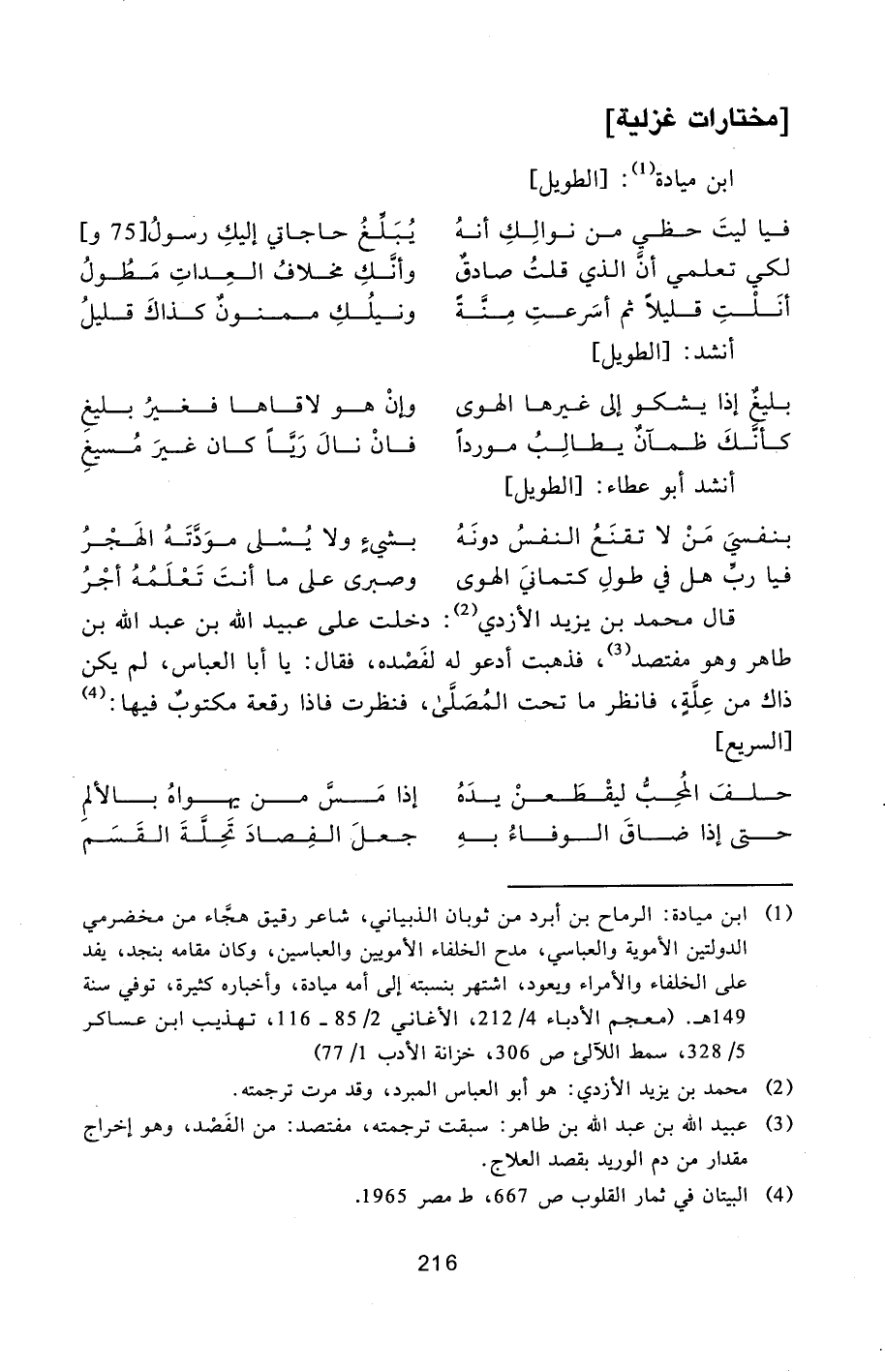 [1] ابن ميادة: الرماح بن أبرد من ثوبان الذبياني، شاعر رقيق هجّاء من مخضرمي الدولتين الأموية والعباسي، مدح الخلفاء الأمويين والعباسين، وكان مقامه بنجد، يفد على الخلفاء والأمراء ويعود، اشتهر بنسبته إلى أمه ميادة، وأخباره كثيرة، توفي سنة 149 هـ. (معجم الأدباء 4/212، الأغاني 2/85- 116، تهذيب ابن عساكر 5/328، سمط اللآلئ ص 306، خزانة الأدب 1/77)