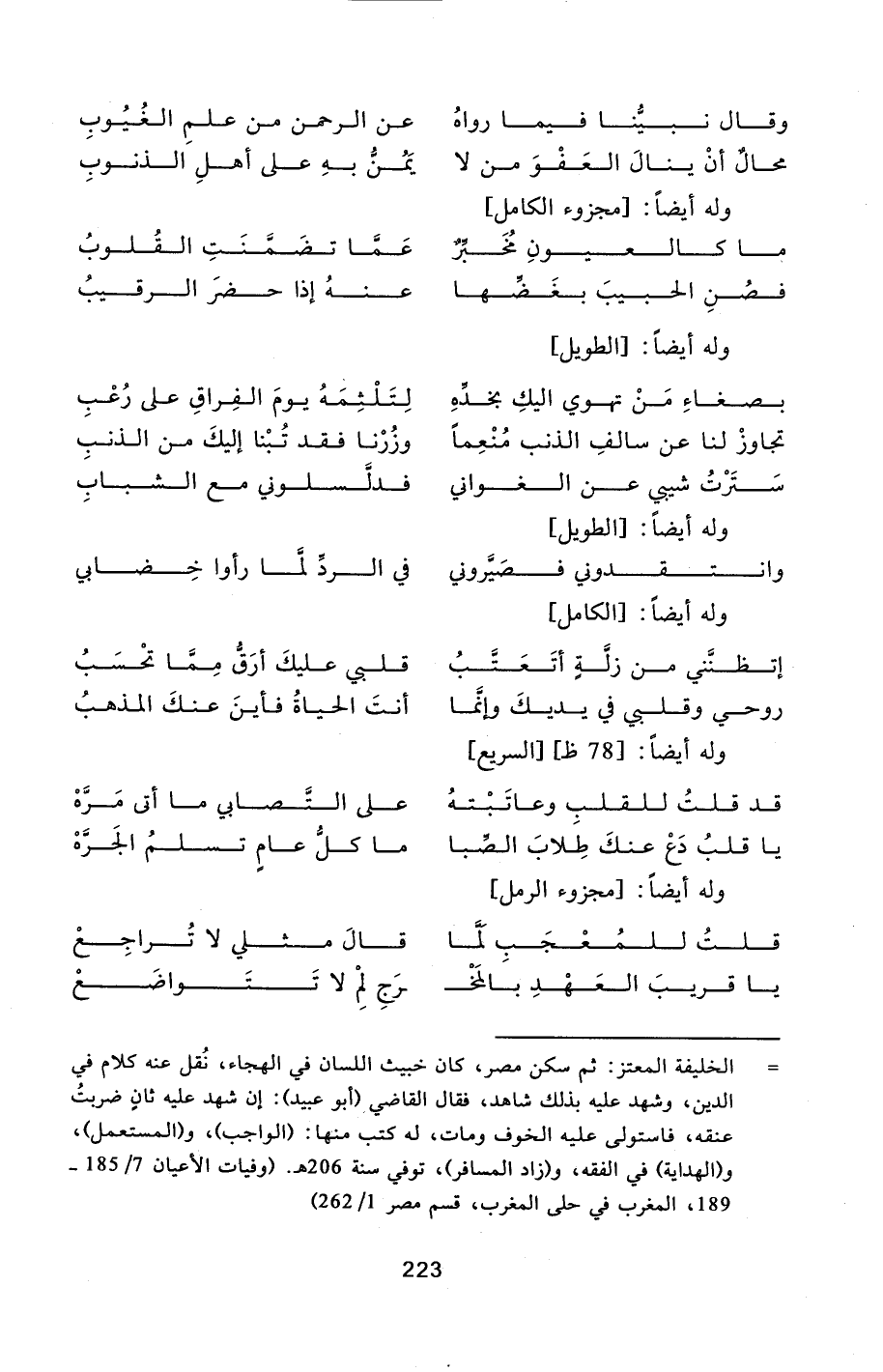 - الخليفة المعتز: ثم سكن مصر، كان خبيث اللسان في الهجاء، نقل عنه كلام في الدين، وشهد عليه بذلك شاهد، فقال القاضي (أبو عبيد) : إن شهد عليه ثان ضربت عنقه، فاستولى عليه الخوف ومات، له كتب منها: (الواجب) ، و (المستعمل) ، و (الهداية) في الفقه، و (زاد المسافر) ، توفي سنة 206 هـ. (وفيات الأعيان 7/185- 189، المغرب في حلى المغرب، قسم مصر 1/262)
