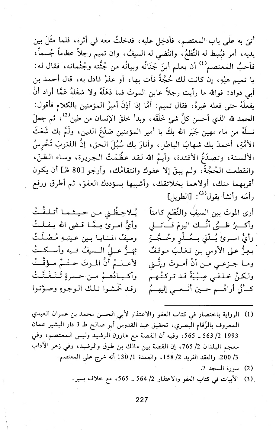 [1] الرواية باختصار في كتاب العفو والاعتذار لأبي الحسن محمد بن عمران العبدي المعروف بالرّقام البصري، تحقيق عبد القدوس أبو صالح ط- 3 دار البشير عمان 1993 2/563- 565، وفيه أن القصة مع هارون الرشيد وليس المعتصم، وفي معجم البلدان 2/765، إن القصة بين مالك بن طوق والرشيد، وفي زهر الآداب 3/200. والعقد الفريد 2/158، والعمدة 1/130 أنه خرج على المعتصم.