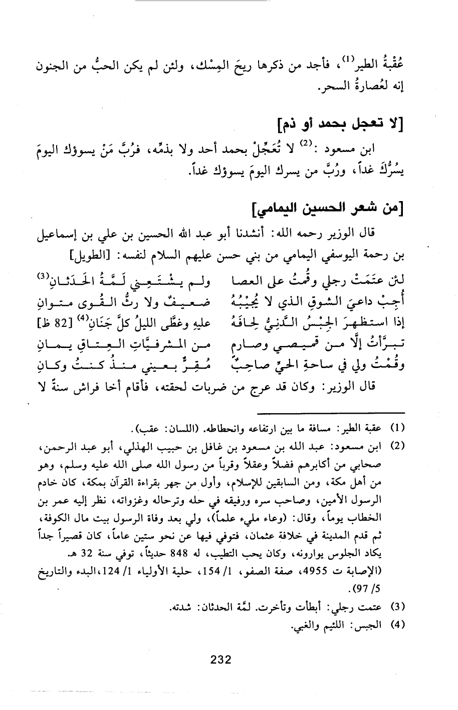 [2] ابن مسعود: عبد الله بن مسعود بن غافل بن حبيب الهذلي، أبو عبد الرحمن، صحابي من أكابرهم فضلا وعقلا وقربا من رسول الله صلى الله عليه وسلم، وهو من أهل مكة، ومن السابقين للإسلام، وأول من جهر بقراءة القرآن بمكة، كان خادم الرسول الأمين، وصاحب سره ورفيقه في حله وترحاله وغزواته، نظر إليه عمر بن الخطاب يوما، وقال: (وعاء مليء علما) ، ولي بعد وفاة الرسول بيت مال الكوفة، ثم قدم المدينة في خلافة عثمان، فتوفي فيها عن نحو ستين عاما، كان قصيرا جدا يكاد الجلوس يوارونه، وكان يحب التطيب، له 848 حديثا، توفي سنة 32 هـ.