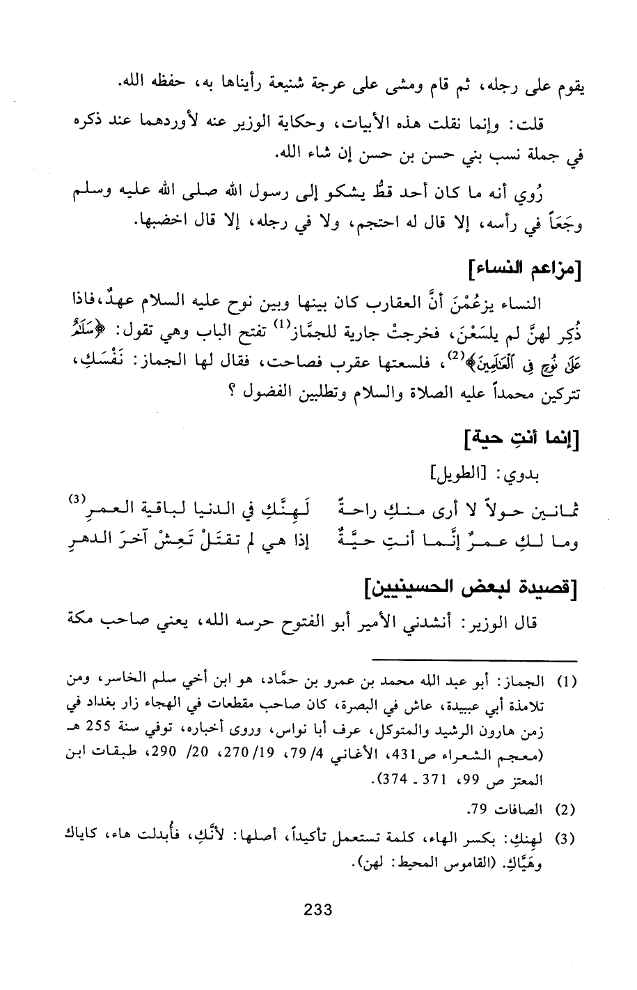 [1] الجماز: أبو عبد الله محمد بن عمرو بن حمّاد، هو ابن أخي سلم الخاسر، ومن تلامذة أبي عببيدة، عاش في البصرة، كان صاحب مقطعات في الهجاء زار بغداد في زمن هارون الرشيد والمتوكل، عرف أبا نواس، وروى أخباره، توفي سنة 255 هـ.