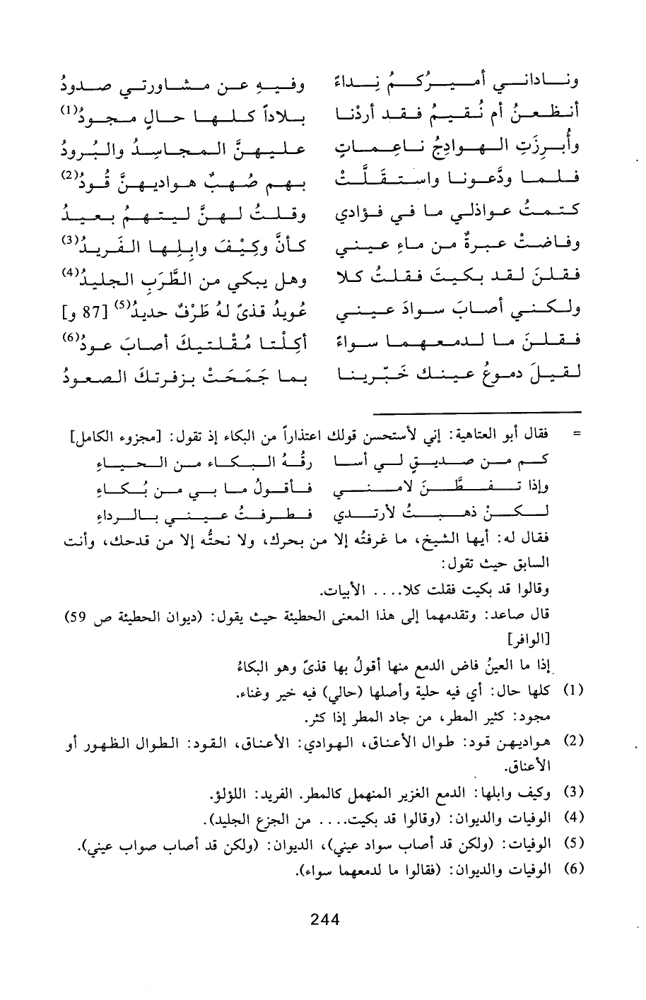 قال صاعد: وتقدمهما إلى هذا المعنى الحطيئة حيث يقول: (ديوان الحطيئة ص 59) [الوافر] إذا ما العين فاض الدمع منها أقول بها قذى وهو البكاء
