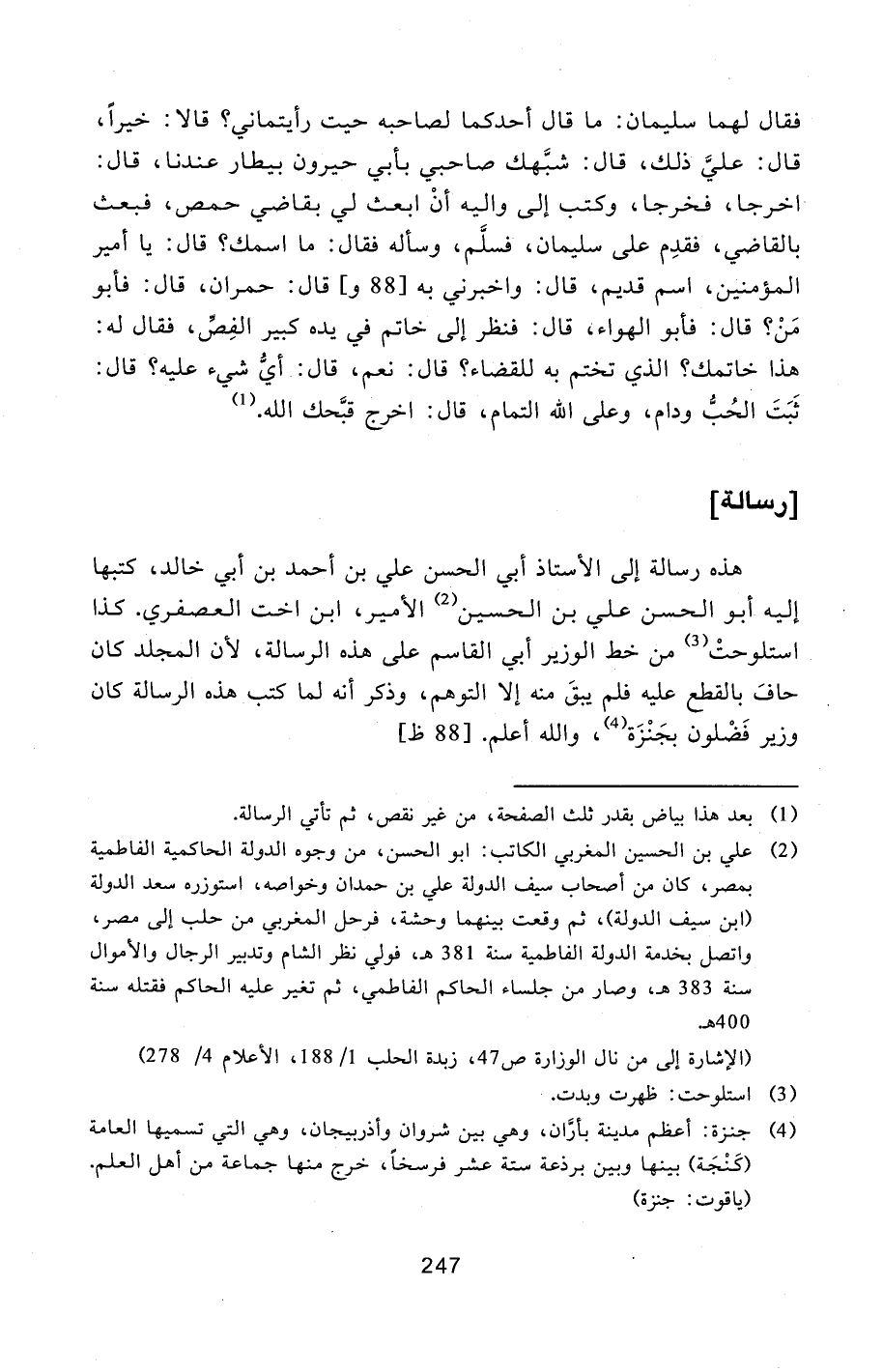 هذه رسالة إلى الأستاذ أبي الحسن علي بن أحمد بن أبي خالد، كتبها إليه أبو الحسن علي بن الحسين [2] الأمير، ابن اخت العصفري. كذا استلوحت [3] من خط الوزير أبي القاسم على هذه الرسالة، لأن المجلد كان حاف بالقطع عليه فلم يبق منه إلا التوهم، وذكر أنه لما كتب هذه الرسالة كان وزير فضلون بجنزة [4] ، والله أعلم. [88 ظ]