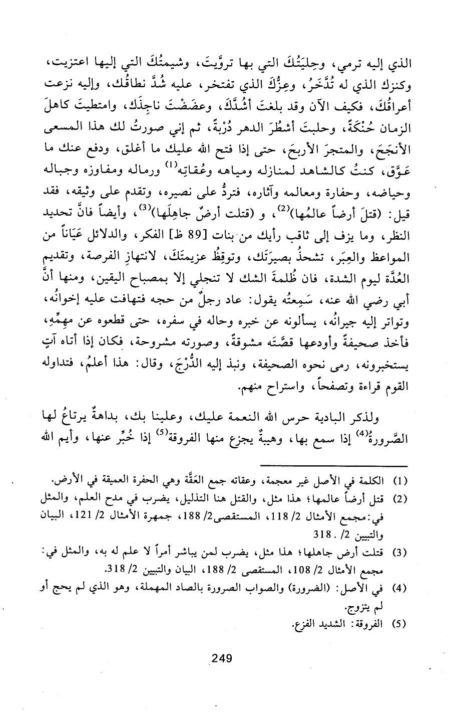 الذي إليه ترمي، وحليتك التي بها تروّيت، وشيمتك التي إليها اعتزيت، وكنزك الذي له تدّخر، وعزّك الذي تفتخر، عليه شدّ نطاقك، وإليه نزعت أعراقك، فكيف الآن وقد بلغت أشدّك، وعضضت ناجذك، وامتطيت كاهل الزمان حنكة، وحلبت أشطر الدهر دربة، ثم إني صورت لك هذا المسعى الأنجح، والمتجر الأربح، حتى إذا فتح الله عليك ما أغلق، ودفع عنك ما عوّق، كنت كالشاهد لمنازله ومياهه وعقاته [1] ورماله ومفاوزه وجباله وحياضه، وحفارة ومعالمه وآثاره، فتردّ على نصيره، وتقدم على وثيقه، فقد قيل: (قتل أرضا عالمها) [2] ، و (قتلت أرض جاهلها) [3] ، وأيضا فانّ تحديد النظر، وما يزف إلى ثاقب رأيك من بنات [89 ظ] الفكر، والدلائل عيانا من المواعظ والعبر، تشحذ بصيرتك، وتوقظ عزيمتك، لا نتهاز الفرصة، وتقديم العدّة ليوم الشدة، فان ظلمة الشك لا تنجلي إلا بمصباح اليقين، ومنها أنّ أبي رضي الله عنه، سمعته يقول: عاد رجل من حجه فتهافت عليه إخوانه، وتواتر إليه جيرانه، يسألونه عن خبره وحاله في سفره، حتى قطعوه عن مهمّه، فأخذ صحيفة وأودعها قصّته مشوقة، وصورته مشروحة، فكان إذا أتاه آت يستخبرونه، رمى نحوه الصحيفة، ونبذ إليه الدّرج، وقال: هذا أعلم، فتداوله القوم قراءة وتصفحا، واستراح منهم.