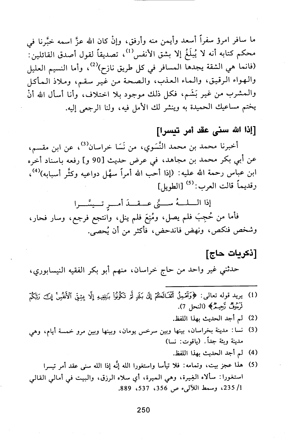 ما سافر امرؤ سفرا أسعد وأيمن منه وأرفق، وإنّ كان الله عزّ اسمه خبّرنا في محكم كتابه أنه لا يبلغ إلا بشق الأنفس [1] ، تصديقا لقول أصدق القائلين: