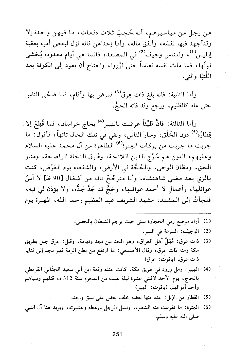 عن رجل من مياسيرهم، أنه حجب ثلاث دفعات، ما فيهن واحدة إلا وقد أجهد فيها نفسه، وأنفق ماله، وأما إحداهن فانه نزل لبعض أمره بعقبة إبليس [1] ، وللناس وجيف [2] في المصعد، فانما هي أيام معدودة يخشى فوتها، فما ملك نفسه نعاسا حتى ثوّروا، واحتاج أن يعود إلى الكوفة بعد اللتيّا والتي.