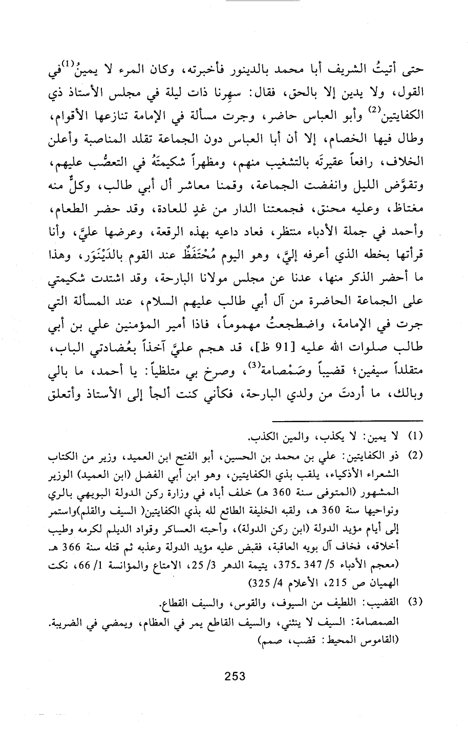 حتى أتيت الشريف أبا محمد بالدينور فأخبرته، وكان المرء لا يمين [1] في القول، ولا يدين إلا بالحق، فقال: سهرنا ذات ليلة في مجلس الأستاذ ذي الكفايتين [2] وأبو العباس حاضر، وجرت مسألة في الإمامة تنازعها الأقوام، وطال فيها الخصام، إلا أن أبا العباس دون الجماعة تقلد المناصبة وأعلن الخلاف، رافعا عقيرته بالتشغيب منهم، ومظهرا شكيمته في التعصّب عليهم، وتقوّض الليل وانفضت الجماعة، وقمنا معاشر أل أبي طالب، وكلّ منه مغتاظ، وعليه محنق، فجمعتنا الدار من غد للعادة، وقد حضر الطعام، وأحمد في جملة الأدباء منتظر، فعاد داعيه بهذه الرقعة، وعرضها عليّ، وأنا قرأتها بخطه الذي أعرفه إليّ، وهو اليوم محتفظ عند القوم بالدينور، وهذا ما أحضر الذكر منها، عدنا عن مجلس مولانا البارحة، وقد اشتدت شكيمتي على الجماعة الحاضرة من آل أبي طالب عليهم السلام، عند المسألة التي جرت في الإمامة، واضطجعت مهموما، فاذا أمير المؤمنين علي بن أبي طالب صلوات الله عليه [91 ظ] ، قد هجم عليّ آخذا بعضادتي الباب، متقلدا سيفين؛ قضيبا وصمصامة [3] ، وصرخ بي متلظيا: يا أحمد، ما بالي وبالك، ما أردت من ولدي البارحة، فكأني كنت ألجأ إلى الأستاذ وأتعلق