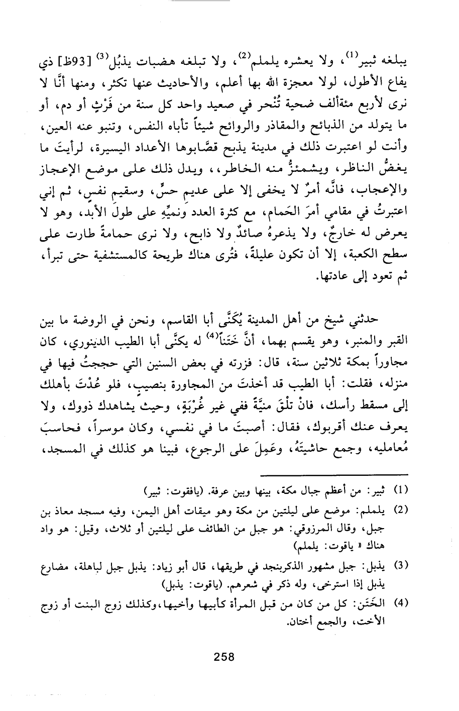 يبلغه ثبير [1] ، ولا يعشره يلملم [2] ، ولا تبلغه هضبات يذبل [3] [93 ظ] ذي يفاع الأطول، لولا معجزة الله بها أعلم، والأحاديث عنها تكثر، ومنها أنّا لا نرى لأربع مئة ألف ضحية تنحر في صعيد واحد كل سنة من فرث أو دم، أو ما يتولد من الذبائح والمقاذر والروائح شيئا تأباه النفس، وتنبو عنه العين، وأنت لو اعتبرت ذلك في مدينة يذبح قصّابوها الأعداد اليسيرة، لرأيت ما يغضّ الناظر، ويشمئزّ منه الخاطر، ويدل ذلك على موضع الإعجاز والإعجاب، فانّه أمر لا يخفى إلا على عديم حسّ، وسقيم نفس، ثم إني اعتبرت في مقامي أمر الحمام، مع كثرة العدد ونميّه على طول الأبد، وهو لا يعرض له خارج، ولا يذعره صائد ولا ذابح، ولا نرى حمامة طارت على سطح الكعبة، إلا أن تكون عليلة، فترى هناك طريحة كالمستشفية حتى تبرأ، ثم تعود إلى عادتها.