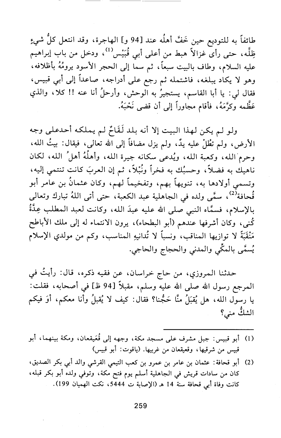 [2] أبو قحافة: عثمان بن عامر بن عمرو بن كعب التيمي القرشي والد أبي بكر الصديق، كان من سادات قريش في الجاهلية أسلم يوم فتح مكة، وتوفي ولده أبو بكر قبله، كانت وفاة أبي قحافة سنة 14 هـ (الإصابة ت 5444، نكت الهميان 199) .