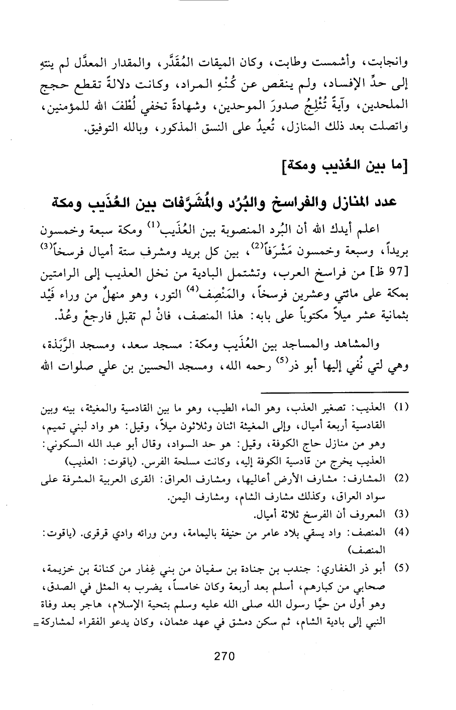 اعلم أيدك الله أن البرد المنصوبة بين العذيب [1] ومكة سبعة وخمسون بريدا، وسبعة وخمسون مشرفا [2] ، بين كل بريد ومشرف ستة أميال فرسخا [3] [97 ظ] من فراسخ العرب، وتشتمل البادية من نخل العذيب إلى الرامتين بمكة على مائتي وعشرين فرسخا، والمنصف [4] التور، وهو منهل من وراء فيد بثمانية عشر ميلا مكتوبا على بابه: هذا المنصف، فان لم تقبل فارجع وعد.