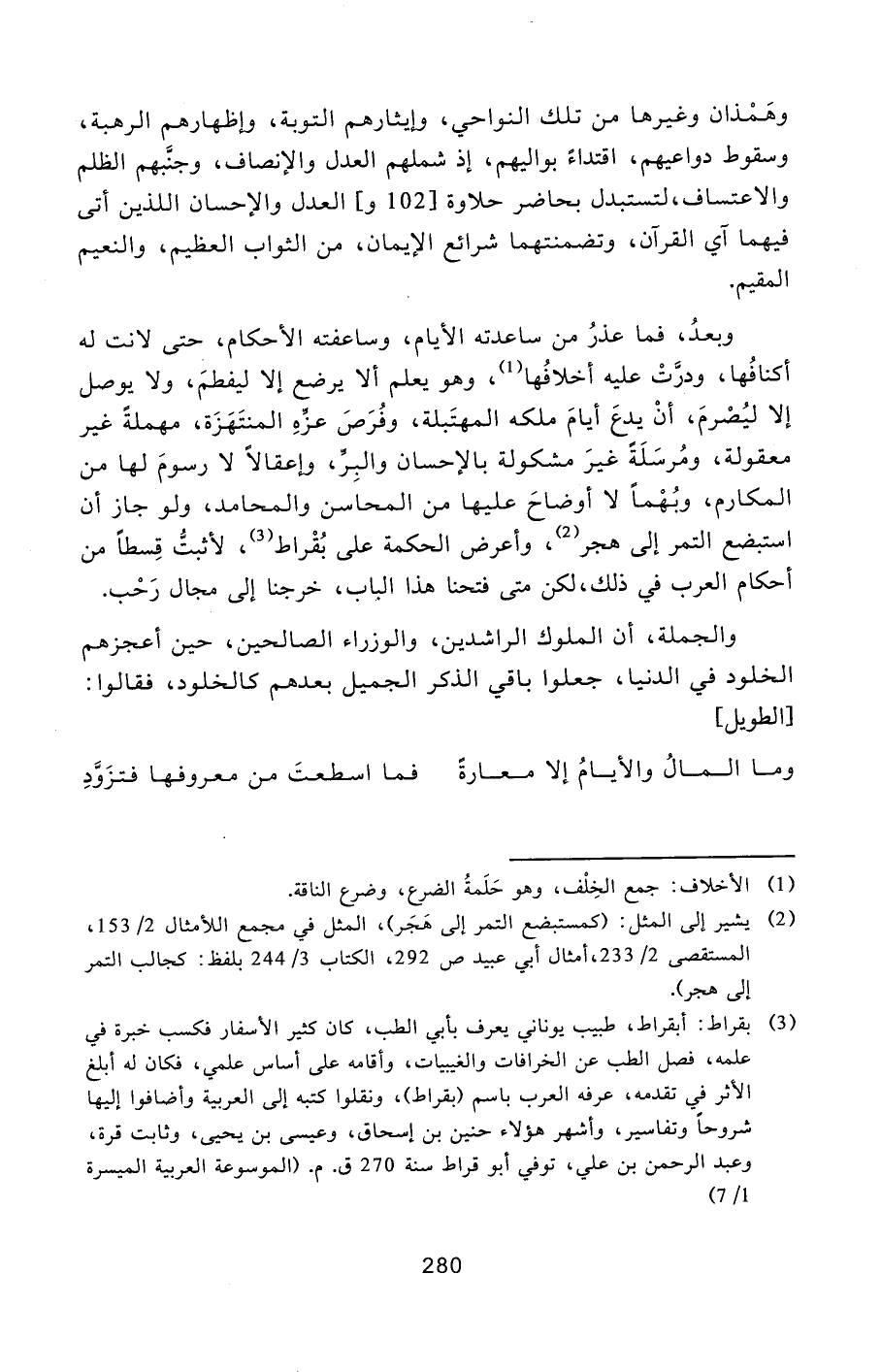 وبعد، فما عذر من ساعدته الأيام، وساعفته الأحكام، حتى لانت له أكنافها، ودرّت عليه أخلافها [1] ، وهو يعلم ألا يرضع إلا ليفطم، ولا يوصل إلا ليصرم، أن يدع أيام ملكه المهتبلة، وفرص عزّه المنتهزة، مهملة غير معقولة، ومرسلة غير مشكولة بالإحسان والبرّ، وإعقالا لا رسوم لها من المكارم، وبهما لا أوضاح عليها من المحاسن والمحامد، ولو جاز أن استبضع التمر إلى هجر [2] ، وأعرض الحكمة على بقراط [3] ، لأثبتّ قسطا من أحكام العرب في ذلك، لكن متى فتحنا هذا الباب، خرجنا إلى مجال رحب.
