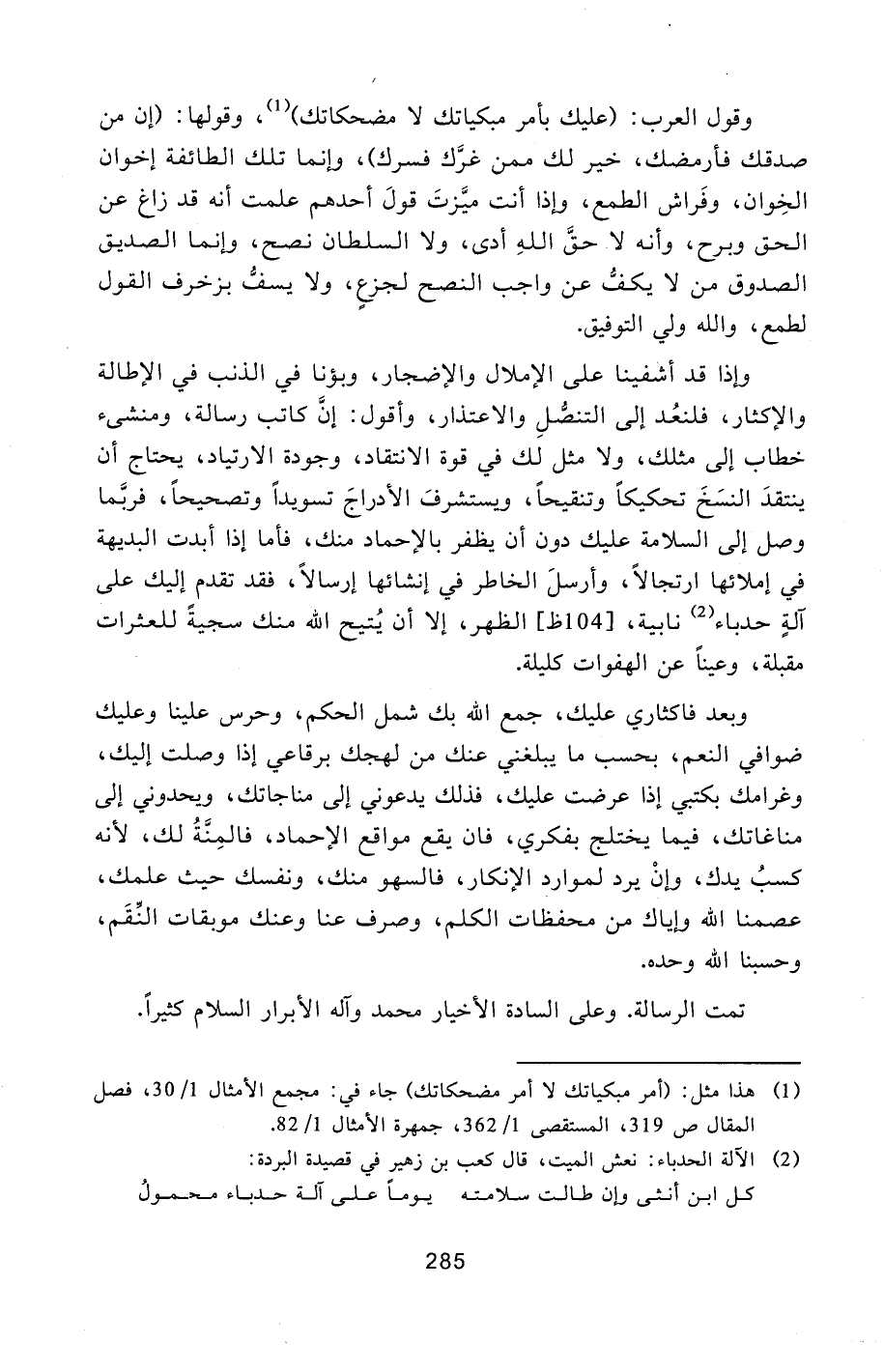 وإذا قد أشفينا على الإملال والإضجار، وبؤنا في الذنب في الإطالة والإكثار، فلنعد إلى التنصّل والاعتذار، وأقول: إنّ كاتب رسالة، ومنشىء خطاب إلى مثلك، ولا مثل لك في قوة الانتقاد، وجودة الارتياد، يحتاج أن ينتقد النسخ تحكيكا وتنقيحا، ويستشرف الأدراج تسويدا وتصحيحا، فربّما وصل إلى السلامة عليك دون أن يظفر بالإحماد منك، فأما إذا أبدت البديهة في إملائها ارتجالا، وأرسل الخاطر في إنشائها إرسالا، فقد تقدم إليك على آلة حدباء [2] نابية، [104 ظ] الظهر، إلا أن يتيح الله منك سجية للعثرات مقبلة، وعينا عن الهفوات كليلة.