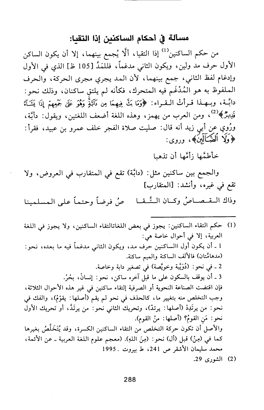 [1] حكم التقاء الساكنين: يجوز في بعض اللغات التقاء الساكنين، ولا يجوز في اللغة العربية، إلا في أحوال خاصة هي: