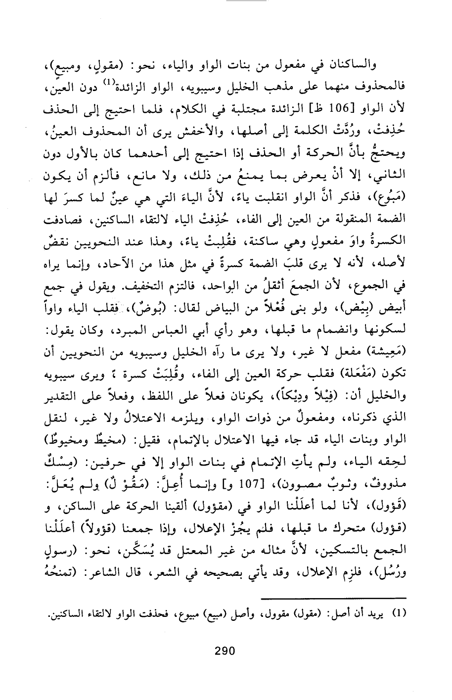 [1] يريد أن أصل: (مقول) مقوول، وأصل (مبيع) مبيوع، فحذفت الواو لالتقاء الساكنين.