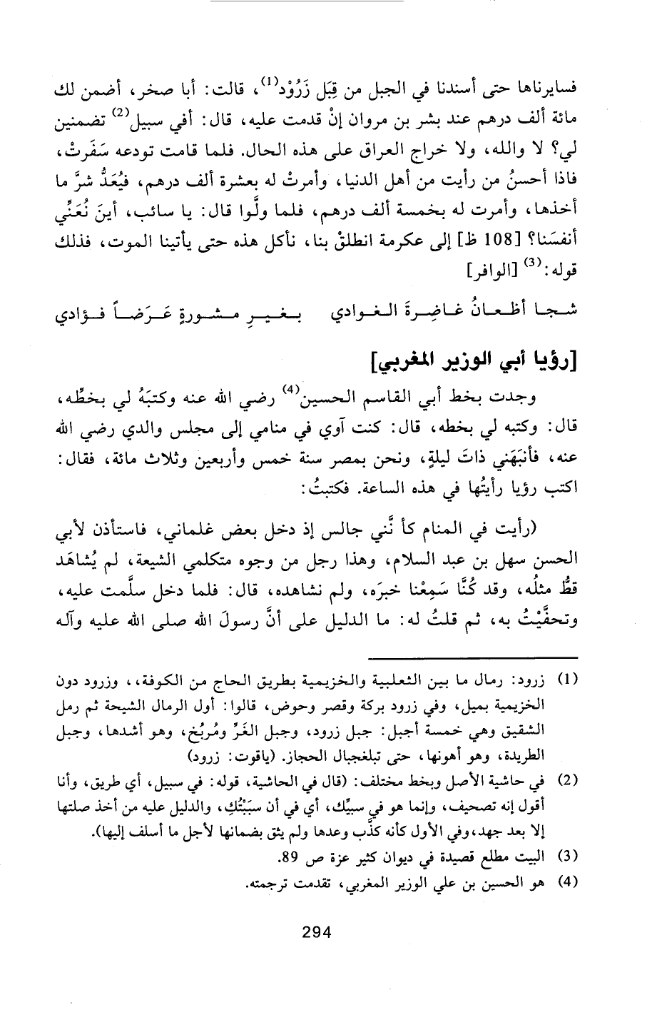 وجدت بخط أبي القاسم الحسين [4] رضي الله عنه وكتبه لي بخطّه، قال: وكتبه لي بخطه، قال: كنت آوي في منامي إلى مجلس والدي رضي الله عنه، فأنبهني ذات ليلة، ونحن بمصر سنة خمس وأربعين وثلاث مائة، فقال: