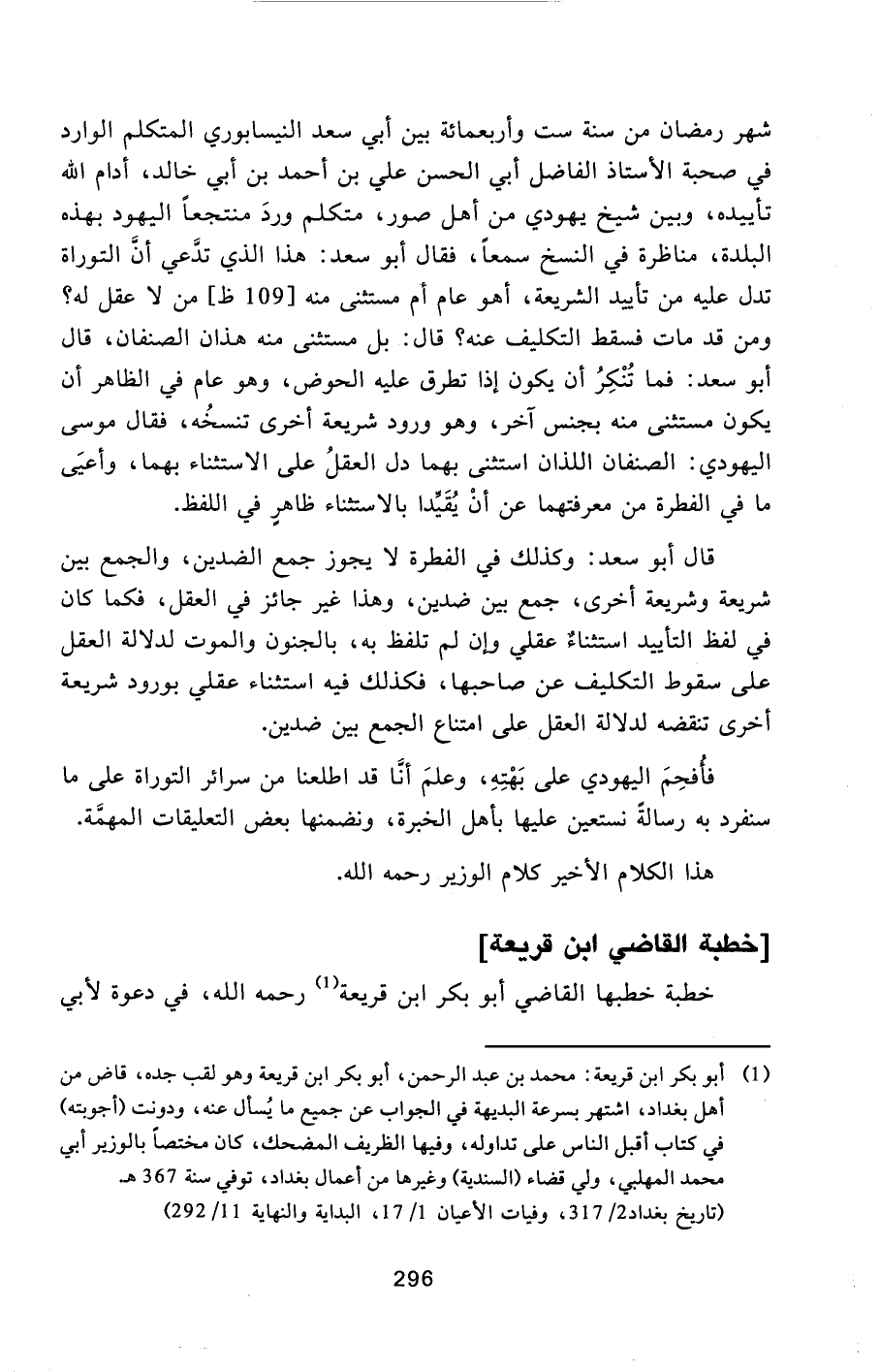 شهر رمضان من سنة ست وأربعمائة بين أبي سعد النيسابوري المتكلم الوارد في صحبة الأستاذ الفاضل أبي الحسن علي بن أحمد بن أبي خالد، أدام الله تأييده، وبين شيخ يهودي من أهل صور، متكلم ورد منتجعا اليهود بهذه البلدة، مناظرة في النسخ سمعا، فقال أبو سعد: هذا الذي تدّعي أنّ التوراة تدل عليه من تأييد الشريعة، أهو عام أم مستثنى منه [109 ظ] من لا عقل له؟