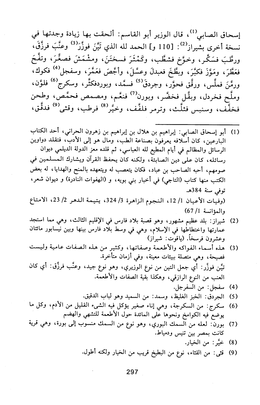 إسحاق الصابي [1] ، قال الوزير أبو القاسم: ألحقت بها زيادة وجدتها في نسخة أخرى بشيراز [2] : [110 و] الحمد لله الذي تيّن فوزّر [3] وعنّب فرزّق، ورطّب فسكّر، وخوّخ فشطّب، وكمثر فسختن، ومشمش فصغّر، وتفّح فعطّر، وموّز فكبّر، وبطّخ فعبدل وعسّل، وأجّص فعمّر، وسفجل [4] فكوك، ورمّن فملّس، ورقّق فحوّر، وجردق [5] فسمّد، وبورد فكثّر، وسكرج [6] فلوّن، وملّح فخردل، وبقّل فخضّر، وبورن [7] فنعّم، ومصمص فحمّص، وطحن فخفّف، وسنبس فثلّث، وترمر فلفّف، وخيّر [8] فرطب، وقثى [9] فدقّق،
