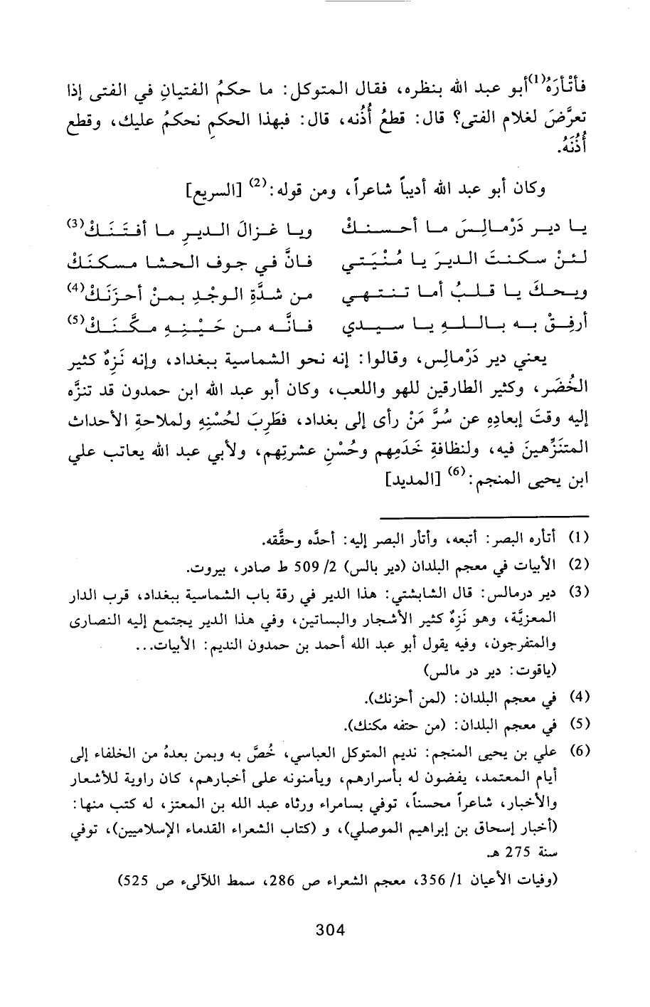 [3] دير درمالس: قال الشابشتي: هذا الدير في رقة باب الشماسية ببغداد، قرب الدار المعزيّة، وهو نزه كثير الأشجار والبساتين، وفي هذا الدير يجتمع إليه النصارى والمتفرجون، وفيه يقول أبو عبد الله أحمد بن حمدون النديم: الأبيات ...