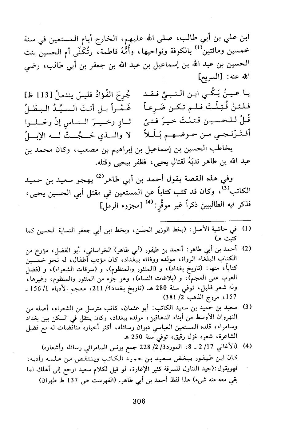 [2] أحمد بن أبي طاهر: أحمد بن طيفور (أبي طاهر) الخراساني، أبو الفضل، مؤرخ من الكتاب البلغاء الرواة، مولده ووفاته ببغداد، كان مؤدب أطفال، له نحو خمسين كتابا، منها: (تاريخ بغداد) ، و (المنثور والمنظوم) ، و (سرقات الشعراء) ، و (فضل العرب على العجم) ، و (بلاغات النساء) ، وهو جزء من المنثور والمنظوم، وغيرها، وله شعر قليل، توفي سنة 280 هـ. (تاريخ بغداد 4/211، معجم الأدباء 1/156- 157، مروج الذهب 2/381)