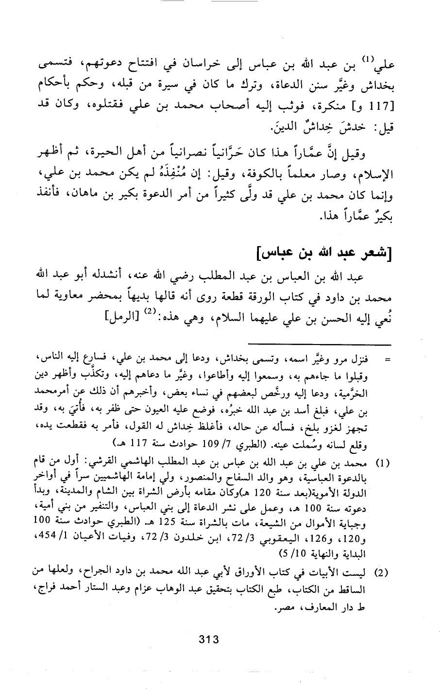 [1] محمد بن علي بن عبد الله بن عباس بن عبد المطلب الهاشمي القرشي: أول من قام بالدعوة العباسية، وهو والد السفاح والمنصور، ولي إمامة الهاشميين سرا في أواخر الدولة الأموية (بعد سنة 120 هـ) وكان مقامه بأرض الشراة بين الشام والمدينة، وبدأ دعوته سنة 100 هـ، وعمل على نشر الدعاة إلى بني العباس، والتنفير من بني أمية، وجباية الأموال من الشيعة، مات بالشراة سنة 125 هـ. (الطبري حوادث سنة 100 و 120، و 126، اليعقوبي 3/72، ابن خلدون 3/72، وفيات الأعيان 1/454، البداية والنهاية 10/5)