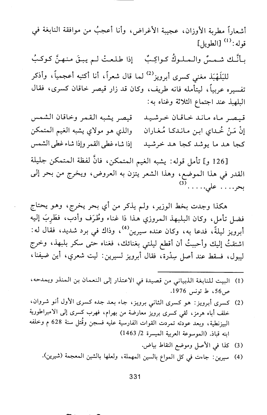 هكذا وجدت بخط الوزير، ولم يذكر من أي بحر يخرج، وهو يحتاج فضل تأمل، وكان البلبهذ المروزي هذا ذا غناء وطرف وأدب، فطرب إليه أبرويز ليلة، فدعا به، وكان عنده سيرين [4] ، وذاك في برد شديد، فقال له: