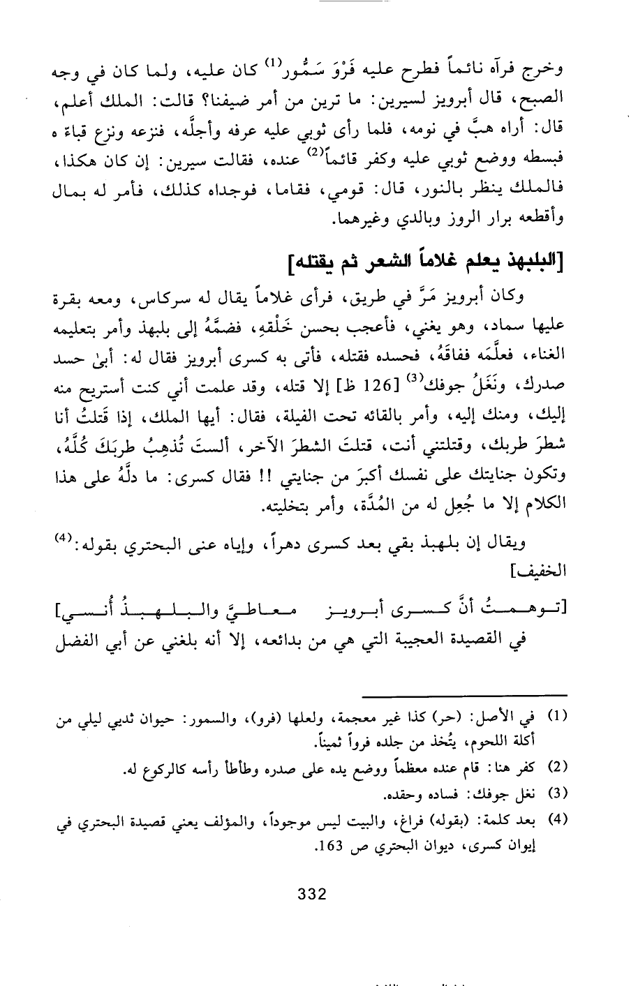 وكان أبرويز مرّ في طريق، فرأى غلاما يقال له سركاس، ومعه بقرة عليها سماد، وهو يغني، فأعجب بحسن خلقه، فضمّه إلى بلبهذ وأمر بتعليمه الغناء، فعلّمه ففاقه، فحسده فقتله، فأتى به كسرى أبرويز فقال له: أبى حسد صدرك، ونغل جوفك [3] [126 ظ] إلا قتله، وقد علمت أني كنت أستريح منه إليك، ومنك إليه، وأمر بالقائه تحت الفيلة، فقال: أيها الملك، إذا قتلت أنا شطر طربك، وقتلتني أنت، قتلت الشطر الآخر، ألست تذهب طربك كلّه، وتكون جنايتك على نفسك أكبر من جنايتي!! فقال كسرى: ما دلّه على هذا الكلام إلا ما جعل له من المدّة، وأمر بتخليته.