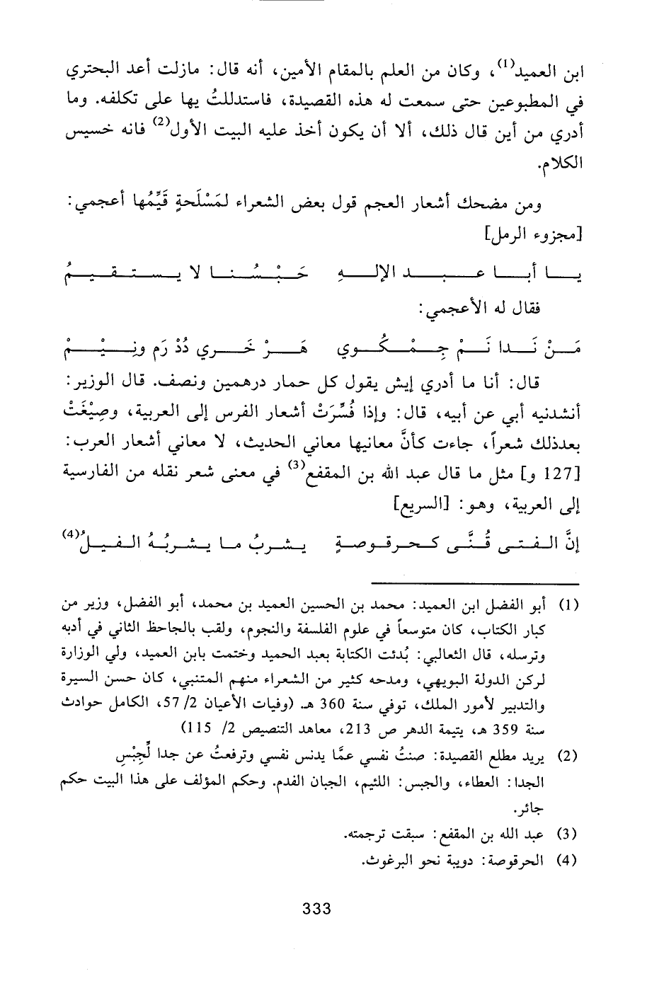 [1] أبو الفضل ابن العميد: محمد بن الحسين العميد بن محمد، أبو الفضل، وزير من كبار الكتاب، كان متوسعا في علوم الفلسفة والنجوم، ولقب بالجاحظ الثاني في أدبه وترسله، قال الثعالبي: بدئت الكتابة بعبد الحميد وختمت بابن العميد، ولي الوزارة لركن الدولة البويهي، ومدحه كثير من الشعراء منهم المتنبي، كان حسن السيرة والتدبير لأمور الملك، توفي سنة 360 هـ. (وفيات الأعيان 2/57، الكامل حوادث سنة 359 هـ، يتيمة الدهر ص 213، معاهد التنصيص 2/115)