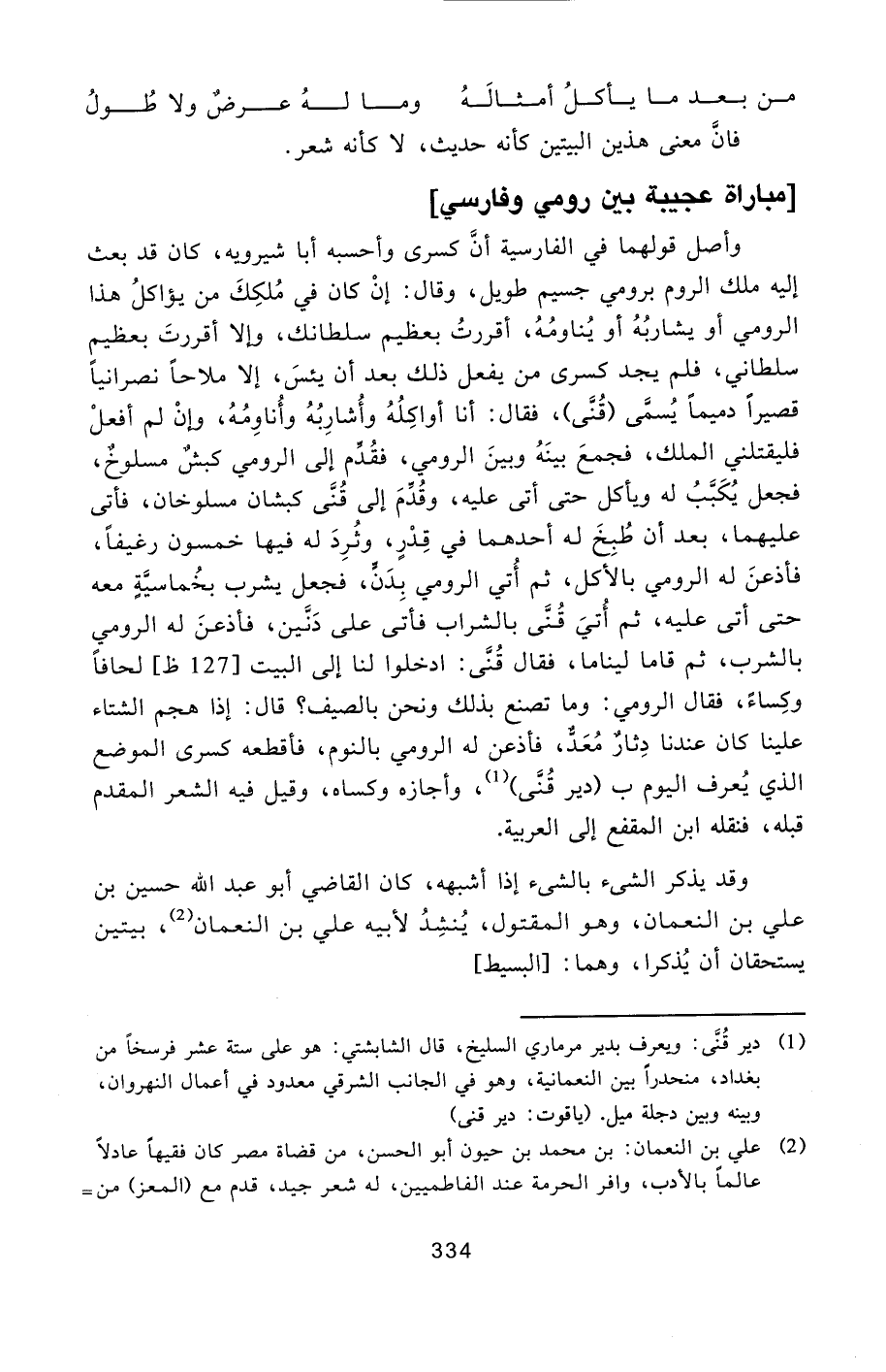 وأصل قولهما في الفارسية أنّ كسرى وأحسبه أبا شيرويه، كان قد بعث إليه ملك الروم برومي جسيم طويل، وقال: إن كان في ملكك من يؤاكل هذا الرومي أو يشاربه أو يناومه، أقررت بعظيم سلطانك، وإلا أقررت بعظيم سلطاني، فلم يجد كسرى من يفعل ذلك بعد أن يئس، إلا ملاحا نصرانيا قصيرا دميما يسمّى (قنّى) ، فقال: أنا أواكله وأشاربه وأناومه، وإن لم أفعل فليقتلني الملك، فجمع بينه وبين الرومي، فقدّم إلى الرومي كبش مسلوخ، فجعل يكبّب له ويأكل حتى أتى عليه، وقدّم إلى قنّى كبشان مسلوخان، فأتى عليهما، بعد أن طبخ له أحدهما في قدر، وثرد له فيها خمسون رغيفا، فأذعن له الرومي بالأكل، ثم أتي الرومي بدنّ، فجعل يشرب بخماسيّة معه حتى أتى عليه، ثم أتي قنّى بالشراب فأتى على دنّين، فأذعن له الرومي بالشرب، ثم قاما ليناما، فقال قنّى: ادخلوا لنا إلى البيت [127 ظ] لحافا وكساء، فقال الرومي: وما تصنع بذلك ونحن بالصيف؟ قال: إذا هجم الشتاء علينا كان عندنا دثار معدّ، فأذعن له الرومي بالنوم، فأقطعه كسرى الموضع الذي يعرف اليوم ب (دير قنّى) [1] ، وأجازه وكساه، وقيل فيه الشعر المقدم قبله، فنقله ابن المقفع إلى العربية.