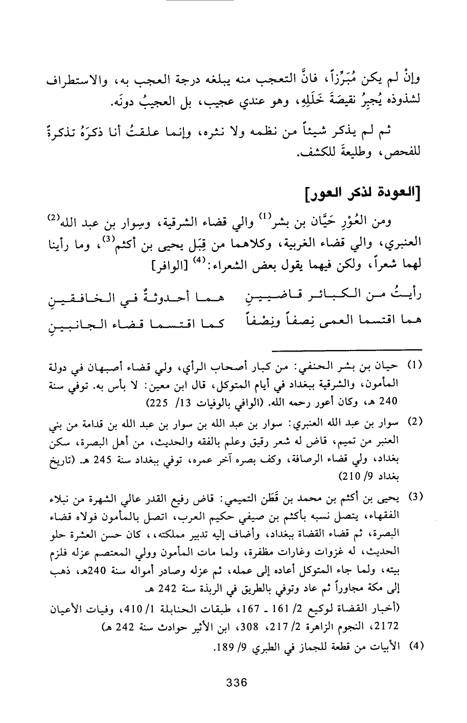ومن العور حيّان بن بشر [1] والي قضاء الشرقية، وسوار بن عبد الله [2] العنبري، والي قضاء الغربية، وكلاهما من قبل يحيى بن أكثم [3] ، وما رأينا لهما شعرا، ولكن فيهما يقول بعض الشعراء: [4] [الوافر]