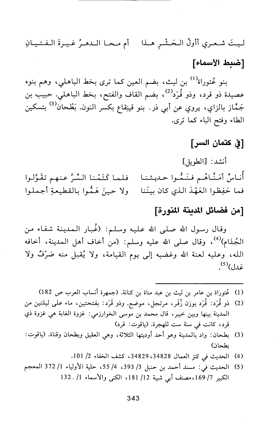 بنو عتوراة [1] بن ليث، بضم العين كما ترى بخط الباهلي، وهم بنوه عصيدة ذو قرد، وذو قرد [2] ، بضم القاف والفتح، بخط الباهلي. حبيب بن جمّاز بالزاي، يروي عن أبي ذر. بنو قينقاع بكسر النون. بطحان [3] بتسكين الطاء وفتح الباء كما ترى.