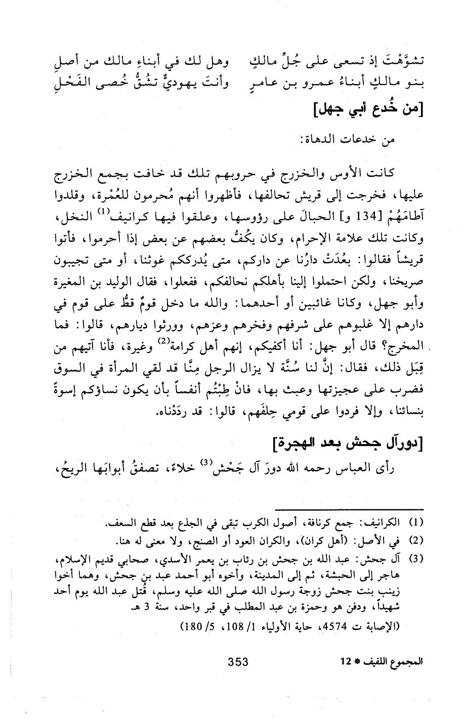 [3] آل جحش: عبد الله بن جحش بن رئاب بن يعمر الأسدي، صحابي قديم الإسلام، هاجر إلى الحبشة، ثم إلى المدينة، وأخوه أبو أحمد عبد بن جحش، وهما أخوا زينب بنت جحش زوجة رسول الله صلى الله عليه وسلم، قتل عبد الله يوم أحد شهيدا، ودفن هو وحمزة بن عبد المطلب في قبر واحد، سنة 3 هـ.