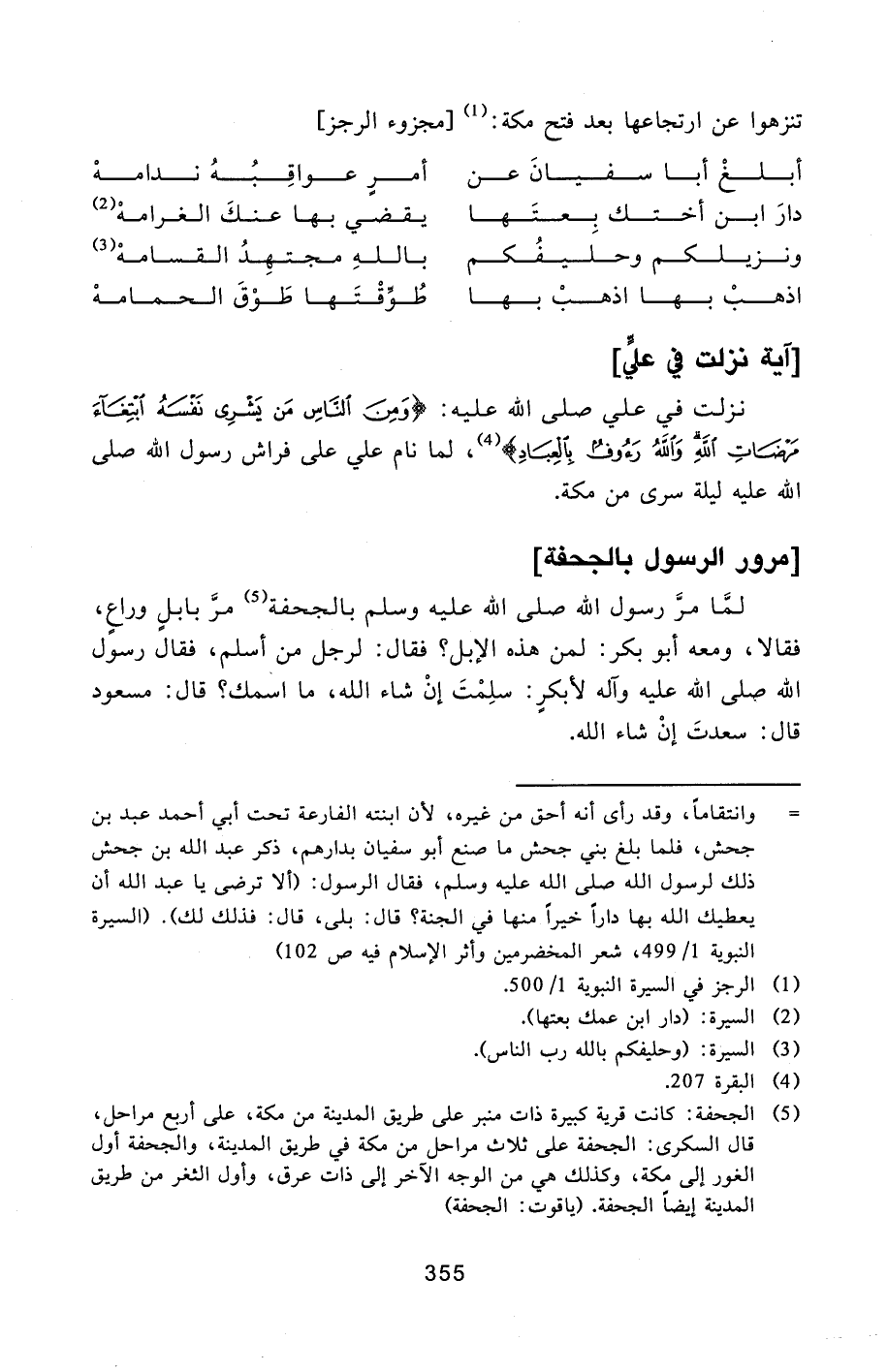 [5] الجحفة: كانت قرية كبيرة ذات منبر على طريق المدينة من مكة، على أربع مراحل، قال السكرى: الجحفة على ثلاث مراحل من مكة في طريق المدينة، والجحفة أول الغور إلى مكة، وكذلك هي من الوجه الآخر إلى ذات عرق، وأول الثغر من طريق المدينة إيضا الجحفة. (ياقوت: الجحفة)