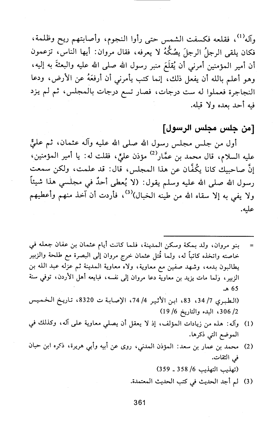 أول من جلس مجلس رسول الله صلى الله عليه وآله عثمان، ثم عليّ عليه السلام، قال محمد بن عمّار [2] مؤذن عليّ، فقلت له: يا أمير المؤمنين، إنّ صاحبيك كانا يكفّان عن هذا المجلس، قال: قد علمت، ولكن سمعت رسول الله صلى الله عليه وسلم يقول: (لا يعطى أحد في مجلسي هذا شيئا ولا يفي به إلا سقاه الله من طينه الخبال) [3] ، فأردت أن آخذ منهم وأعطيهم عليه.