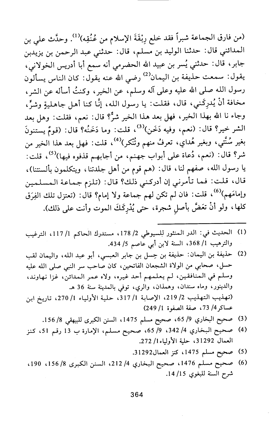 (من فارق الجماعة شبرا فقد خلع ربقة الإسلام من عنقه) [1] . وحدّث علي بن المدائني قال: حدثنا الوليد بن مسلم، قال: حدثني عبد الرحمن بن يزيد بن جابر، قال: حدثني يسر بن عبيد الله الحضرمي أنه سمع أبا أدريس الخولاني، يقول: سمعت حذيفة بن اليمان [2] رضي الله عنه يقول: كان الناس يسألون رسول الله صلى الله عليه وعلى آله وسلم، عن الخير، وكنت أسأله عن الشر، مخافة أن يدركني، قال، فقلت: يا رسول الله، إنّا كنا أهل جاهلية وشرّ، وجاءنا الله بهذا الخير، فهل بعد هذا الخير شرّ؟ قال: نعم، فقلت: وهل بعد الشر خير؟ قال: (نعم، وفيه دخن) [3] ، قلت: وما دخنه؟ قال: (قوم يستنون بغير سنّتي، وبغير هداي، تعرف منهم وتنكر) [4] ، قلت: فهل بعد هذا الخير من شر؟ قال: (نعم، دعاة على أبواب جهنم، من أجابهم قذفوه فيها) [5] ، قلت: